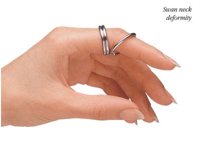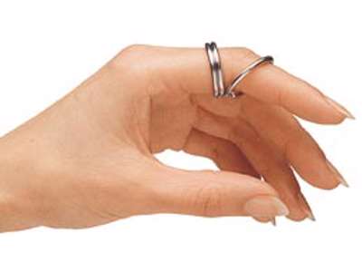 Fås i rustfri stålfjederwire, eller let bearbejdelig sterling sølv. Sterling sølv er lettere at forme for at tilpasse til mindre forskellig i fingeromkredsen og for at tilrette den ønskede fleksion for at holde PIP -leddet fra hyperekstension. Anvendes til at begrænse unormal hyperekstension mens den tillader fuld aktiv fleksion i PIP-leddet. Kan anvendes på DIP- og PIP-led mht. lateral stabilitet og ledbeskyttelse. Giver stabilitet til leddet, hvis skinnen vendes omvendt ved knaphulsdeformitet eller ved lateral placering. Størrelser er de samme som standard ringstørrelser. For størrelse, mål omkredsen af det PIP- eller DIP-led hvor ringen skal anlægges. For at opnå større sikkerhed ved måltagning kan Murphy Ring Sizer anvendes. Ved halve størrelser anvendes den næste større størrelse.     Rustfri stål Sterling Sølv DIP/PIP Størrel se NC15681-02 NC15685-02 4,0 cm 2 NC15681-03 NC15685-03 4,4 cm 3 NC15681-04 NC15685-04 4,6 cm 4 NC15681-05 NC15685-05 4,9 cm 5 NC15681-06 NC15685-06 5,2 cm 6 NC15681-07 NC15685-07 5,4 cm 7 NC15681-08 NC15685-08 5,7 cm 8 NC15681-09 NC15685-09 5,9 cm 9 NC15681-10 NC15685-10 6,2 cm 10 NC15681-11 NC15685-11 6,5 cm 11 NC15681-12 NC15685-12 6,8 cm 12 NC15681-13 NC15685-13 7,0 cm 13